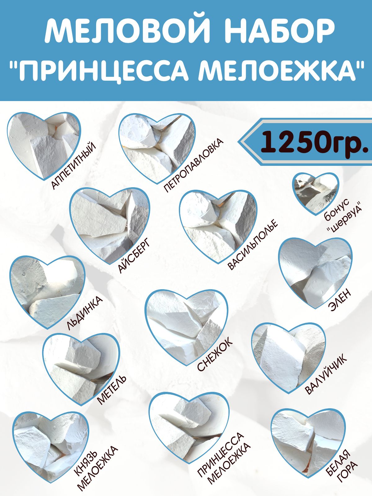 В набор входит кусковой мел различных сортов: "Принцесса мелоежка", "Князь Мелоежка", "Айсберг", "Петропавловка", "Аппетитный", "Элен", "Снежок", "Валуйчик", "Белая Гора", "Метель", "Льдинка", "Васильполье" и бонус "Шервуд". Жирный мел, сухой мел, твердый и мягкий - сорт найдется на любой вкус. Все они разные текстуре. Пищевой мел со вкусом мела, не подвергается обработке, сохраняет все природные качества, без красителей и ароматизаторов. Подходит для употребления и станет необычным подарком на 8 марта, день рождения и любой другой праздник. Чистый кальций 1000. Чистый пищевой мел особенно по душе придется беременным, так же как пищевая природная глина. Может подойти, как отличный съедобный подарок, т.к. упаковка красивая и аккуратная. Съедобный крем из белой или голубой глины прекрасно дополнит вкусовые качества, а найти природную глину, кусковой мел можно в сопутствующих товарах в нашем магазине.