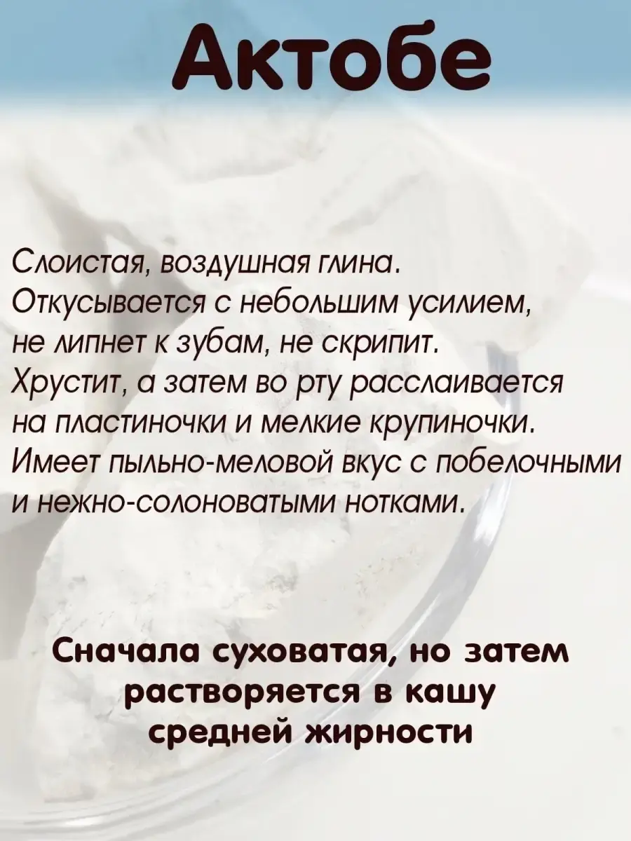 Особое внимание уделяется качеству сырья: натуральная белая узбекская глина проходит строгий контроль перед попаданием к потребителю. Это гарантия безопасности использования продукта как наружного средства по уходу за лицом или съедобного компонента рациона.