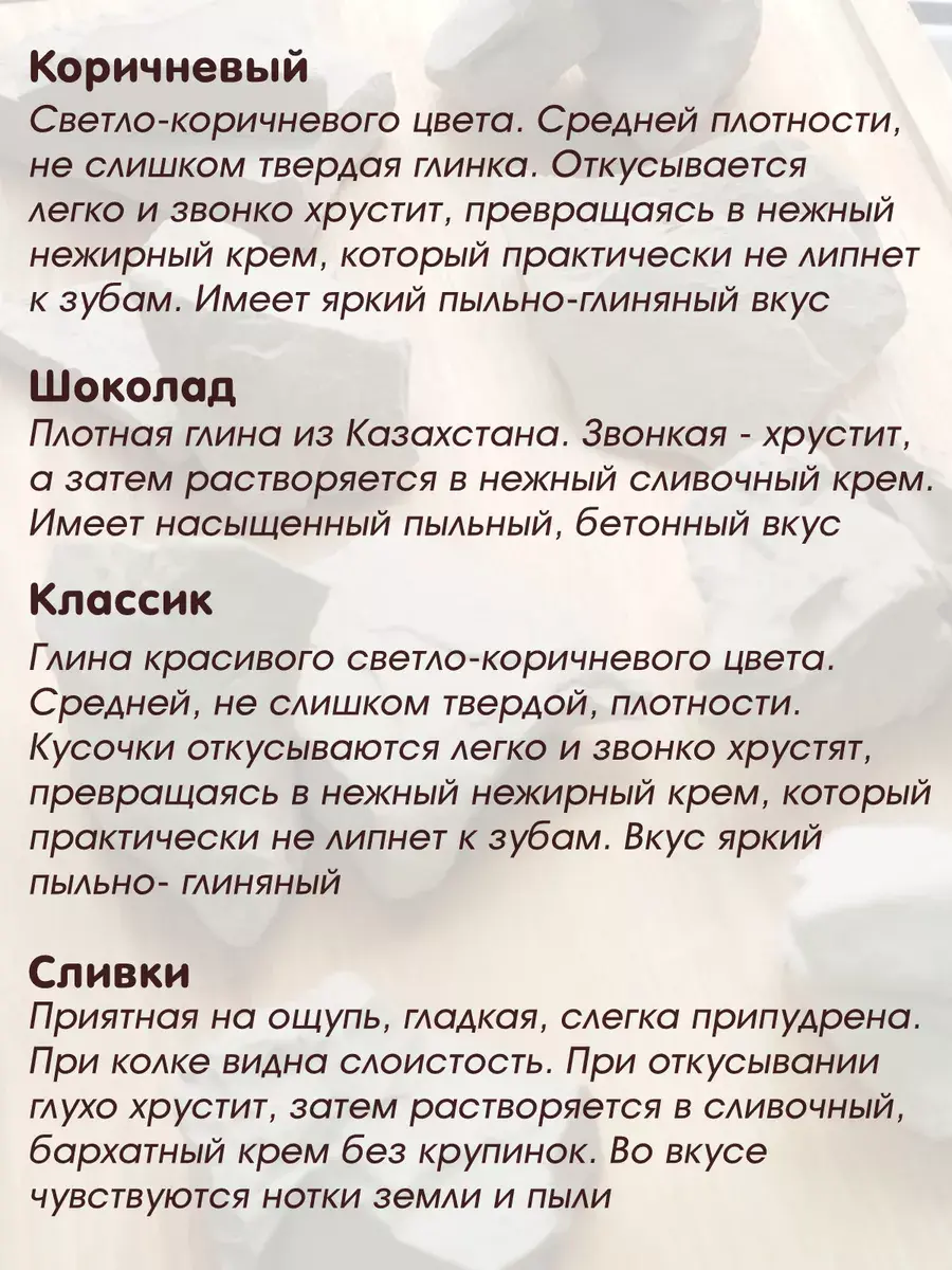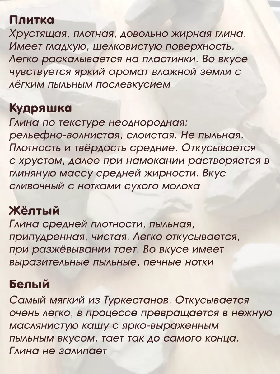 Особое внимание уделяется качеству сырья: натуральная белая узбекская глина проходит строгий контроль перед попаданием к потребителю. Это гарантия безопасности использования продукта как наружного средства по уходу за лицом или съедобного компонента рациона.