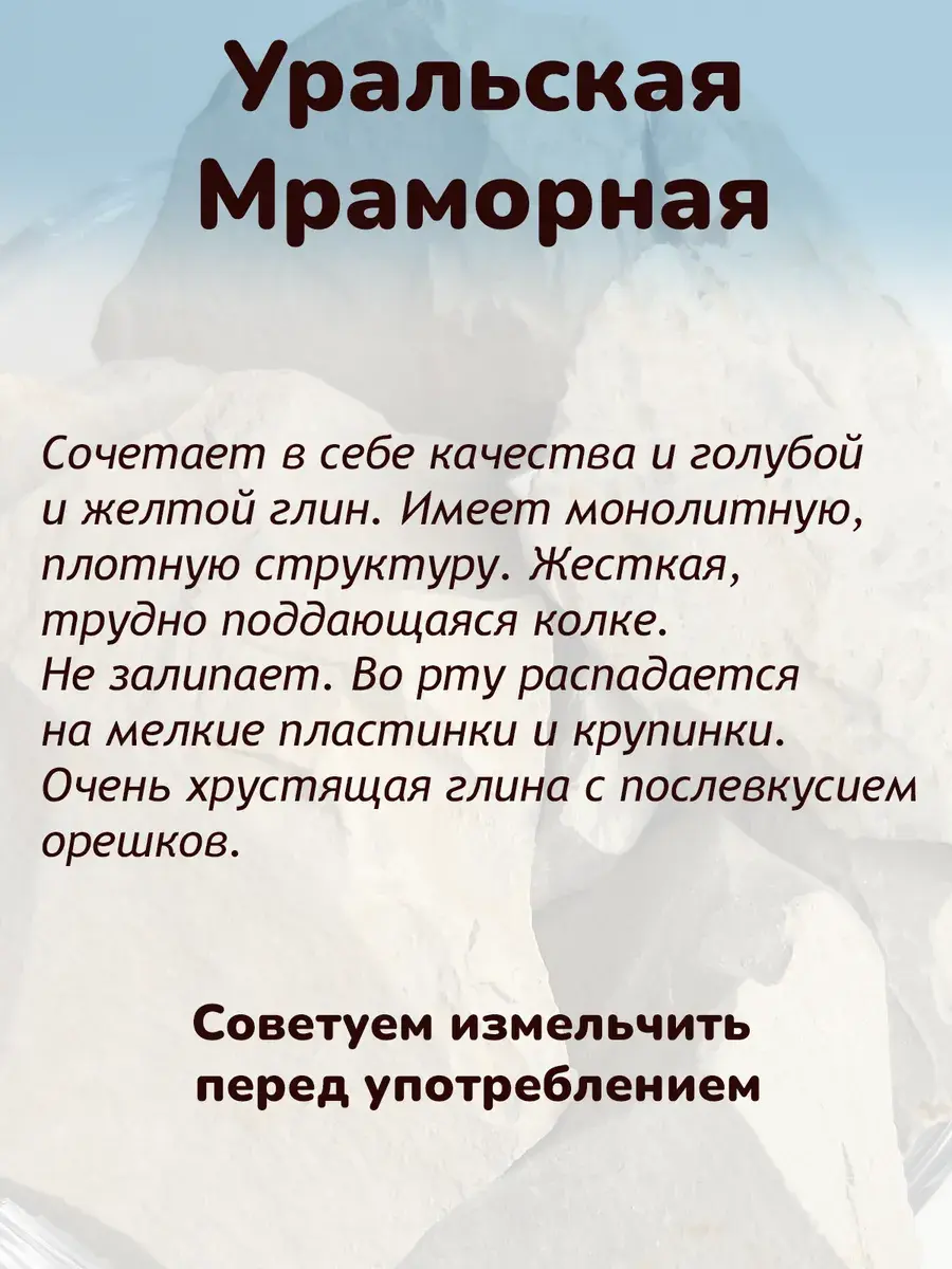 В составе содержатся компоненты природного происхождения: мел, морская соль и минералы Туркестана, Урала и Узбекистана. Это обеспечивает комплексный уход за телом – от очищения до насыщения полезными веществами. Глиномел с приятным вкусом можно использовать как напиток или добавку к рациону — это поддержит здоровье кишечника и улучшит самочувствие.