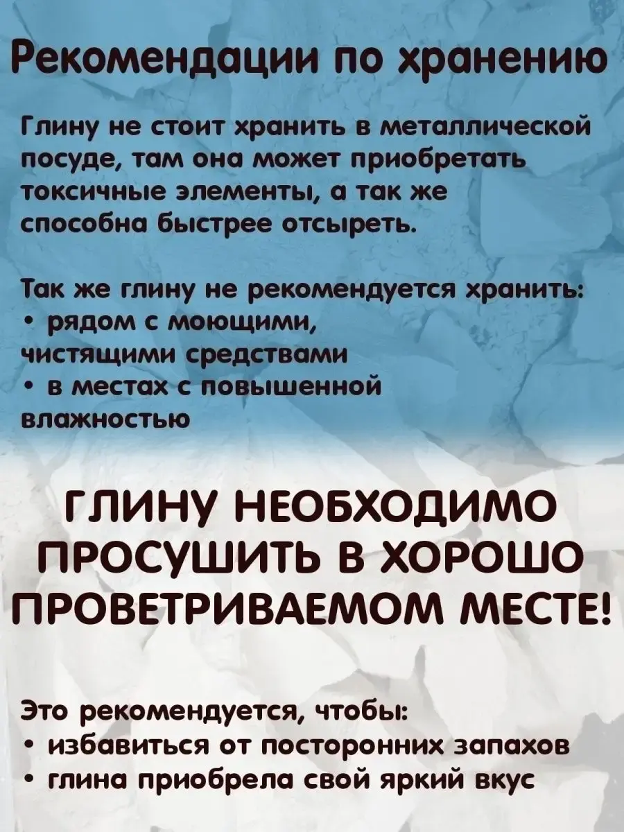Особое внимание уделяется качеству сырья: натуральная белая узбекская глина проходит строгий контроль перед попаданием к потребителю. Это гарантия безопасности использования продукта как наружного средства по уходу за лицом или съедобного компонента рациона.