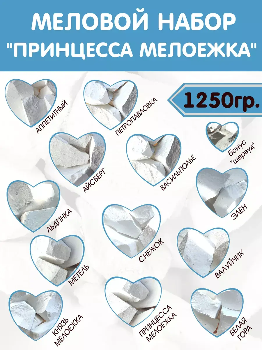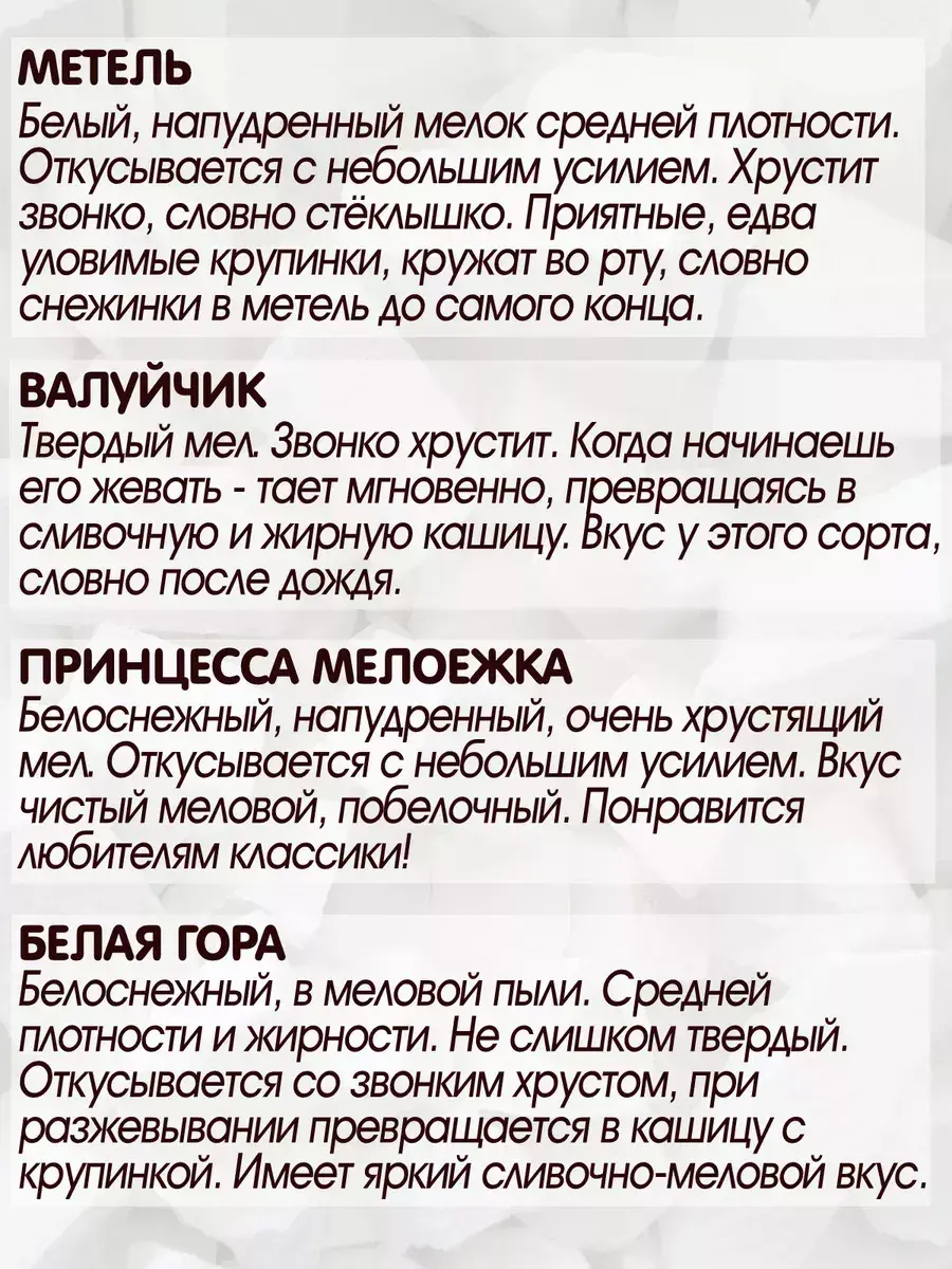 В набор входит кусковой мел различных сортов: "Принцесса мелоежка", "Князь Мелоежка", "Айсберг", "Петропавловка", "Аппетитный", "Элен", "Снежок", "Валуйчик", "Белая Гора", "Метель", "Льдинка", "Васильполье"