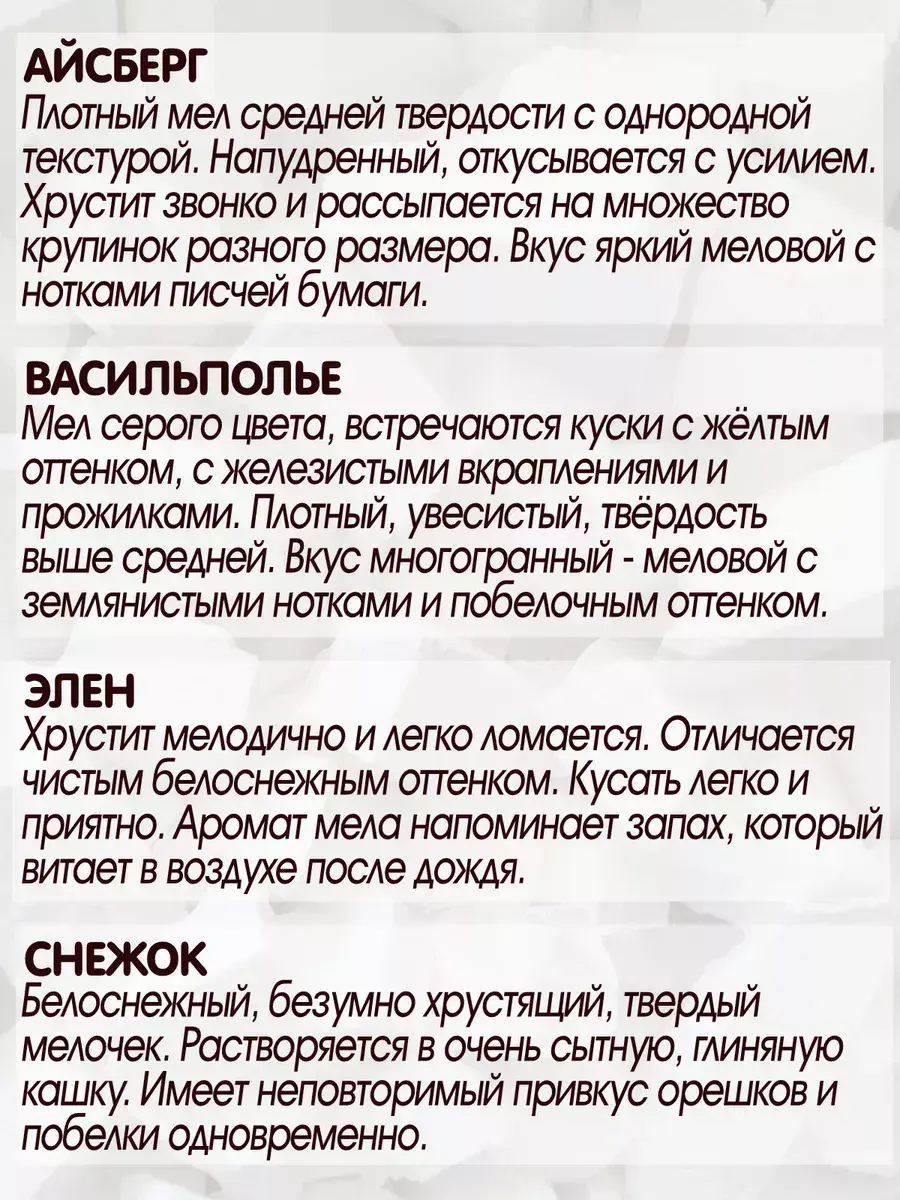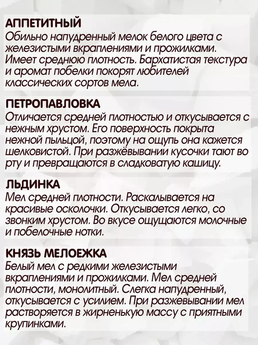 и бонус"Шервуд". Каждый вид находится в индивидуальной подписанной упаковке. Мелки природные. Подойдет как для беременных подарок. Мел для еды белый, мел школьный. Различные сорта имеют разные вкусы и текстуры: твердый или мягкий, жирныйили сухой. Мел съедобный набор поможет найти самые любимые сорта. Мел съедобный для беременных из нашего магазина подходит беременным. Портновский мел, а так же кальций для детей. Перед покупкой мел пищевой кусковой внимательно ознакомьтесь с описанием на втором фото товара. Мел чистый пищевой кусковой со вкусом сливки. Съедобный крем из белой или голубой глины прекрасно дополнит вкусовые качества. Чистый пищевой мел особенно по душе придется беременным, так же как пищевая природная глина. Кусочки мела имеют средний размер, чтобы при желании можно было, как отгрызать от большого куска, так и наколоть его на небольшие камушки.