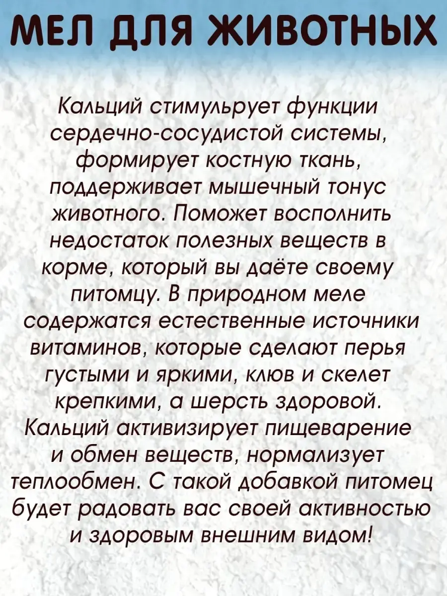 Мел природный 100%. Источник кальция для повышения продуктивности. Кальций стимульрует функции сердечно-сосудистой системы, формирует костную ткань, поддерживает мышечный тонус животного. Поможет восполнить недостаток полезных веществ в корме, который вы даёте своему питомцу. В природном меле содержатся естественные источники витаминов, которые сделают перья густыми и яркими, клюв и скелет крепкими, а шерсть здоровой. Кальций активизирует пищеварение и обмен веществ, нормализует теплообмен, профилактирует нарушения кальциевого обмена, рахит;помогает получить здоровое потомство;способствует повышению продуктивности;обеспечивает правильное формирование костной ткани. С такой добавкой питомец будет радовать вас своей активностью и здоровым внешним видом!