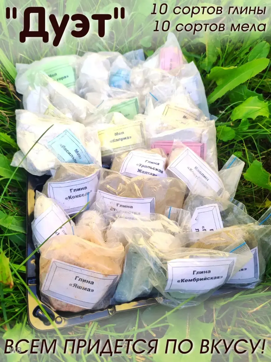 В набор входит 10 различных сортов мела: "Сластена", "Нежность", "Бархат, "Красный", "Премиум", "Белая Гора" , "Васильполье", "Карамель", "Каприз", "Лакомка".И 10 различных сортов глины: "Нуга", "Уйгурская", "Яшма", "Коксоль", "Туркестан Классик", "Голубая Лагуна", "Каолин Донецкий", "Уральская Желтая", "Каолин Костанайский", "Кембрийская" по 50гр.Каждый вид находится в индивидуальной упаковке. Глина съедобная кусковая подходит для употребления и станет необычным подарком на 8 марта, день рождения и любой другой праздник. Природные мел и глина могут послужить даже, как детокс для похудения. Защита лица, маски для лица, защита волос, все это уже давно найдено в глине и активно используется в косметологии. Разные виды глины подходят для различных типов кожи. Как увлажнение лица, так и применение для жирной кожи. Любой понравившийся сорт природной глины можно будет найти большей фасовки в нашем магазине.