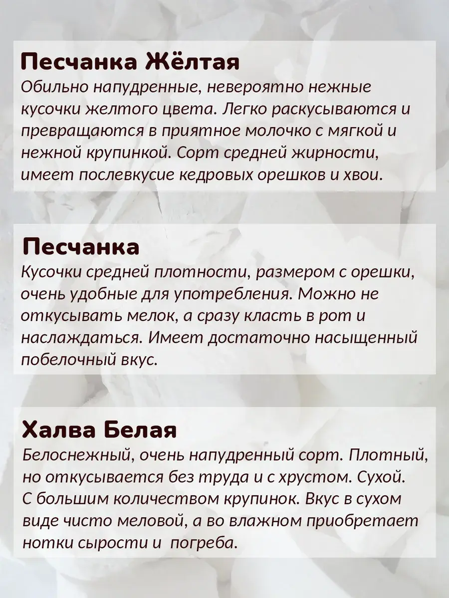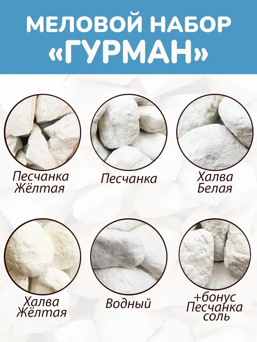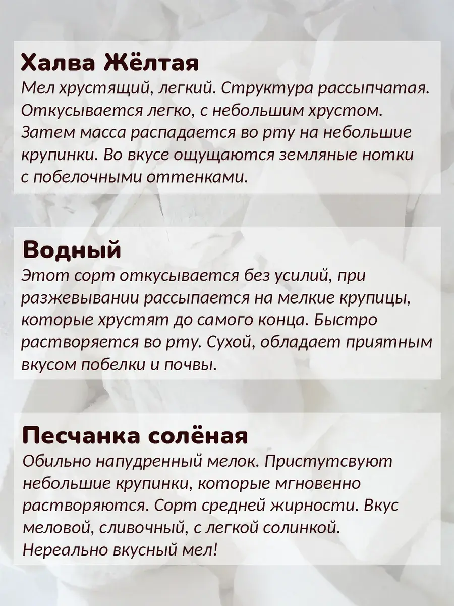 В набор входит кусковой мел различных сортов: "Песчанка желтая", "Песчанка", "Халва белая", "Халва желтая", "Водный" по 100 гр. и "Песчанка соленая" 50гр. Каждый вид находится в индивидуальной подписанной упаковке. Белоснежные меловые камни обладают натуральным составом, что делает их безопасными и полезными для здоровья, включая женщин в период беременности. Благодаря экологичности продукта он отлично вписывается в концепцию eco-продуктов и способствует поддержанию здорового питания. Мелок отличается звонким хрустом, что приносит удовольствие любителям ASMR-эффектов. Пиленый мел белого цвета позволяет создавать яркие и четкие линии на школьных досках, обеспечивая удобство в обучении. Так же в ассортименте есть Уральская глина.