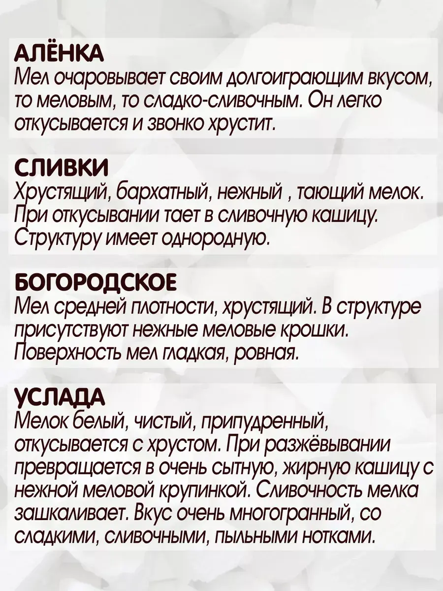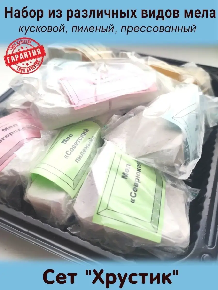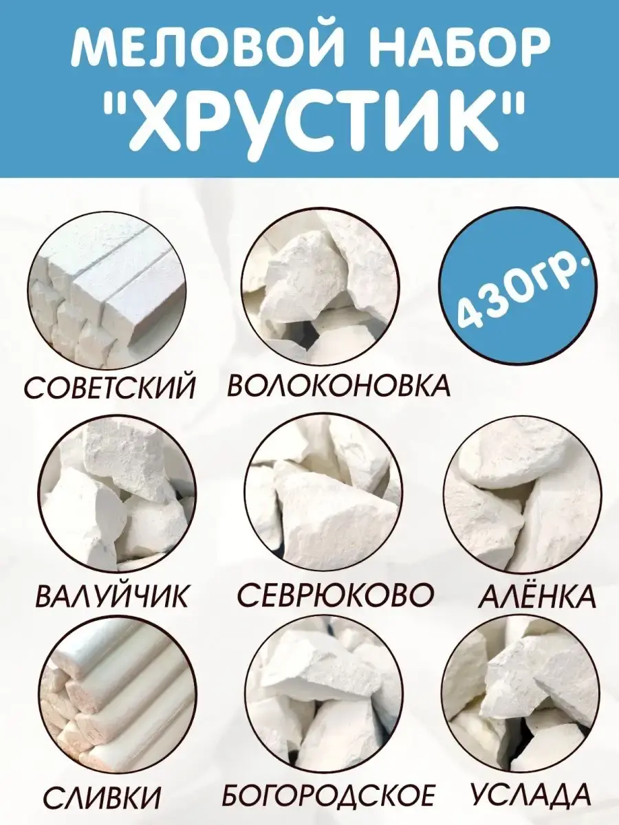 В набор входит кусковой мел различных сортов: "Аленка", "Волоконовка", "Валуйчик", "Услада", "Севрюково", "Богородское" по 50 гр. А так же 2 палочки "Прессованные Сливки" и 2 пиленых брусочка "Советского Школьного" мела. Каждый вид находится в индивидуальной подписанной упаковке. Жирный мел, сухой мел, твердый и мягкий - сорт найдется на любой вкус. Все они разные текстуре. Пищевой мел со вкусом мела, не подвергается обработке, сохраняет все природные качества, без красителей и ароматизаторов. Подходит для употребления и станет необычным подарком на 8 марта, день рождения и любой другой праздник. Чистый кальций 1000. Чистый пищевой мел особенно по душе придется беременным, так же как пищевая природная глина. Может подойти, как отличный съедобный подарок, т.к. упаковка красивая и аккуратная. Съедобный крем из белой или голубой глины прекрасно дополнит вкусовые качества, а найти природную глину, кусковой мел можно в сопутствующих товарах в нашем магазине.