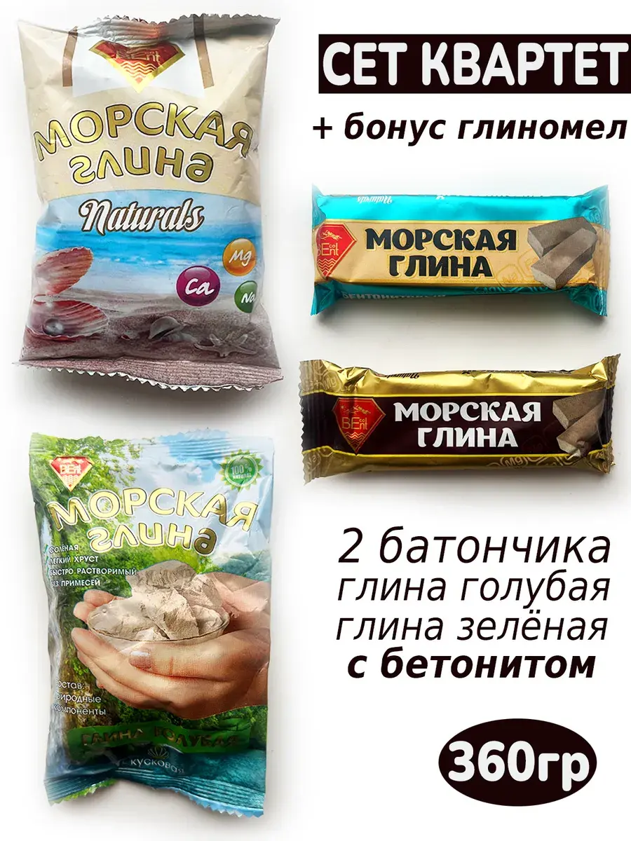 В набор входит кусковая глина различных сортов: "Батончик с голубой узбечкой и бентонитом", "Батончик с зелёной узбечкой и бентонитом", "Морская глина голубая с бетонитом", "Морская глина зеленая с бетонитом" и бонус глиномел.