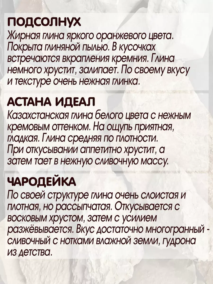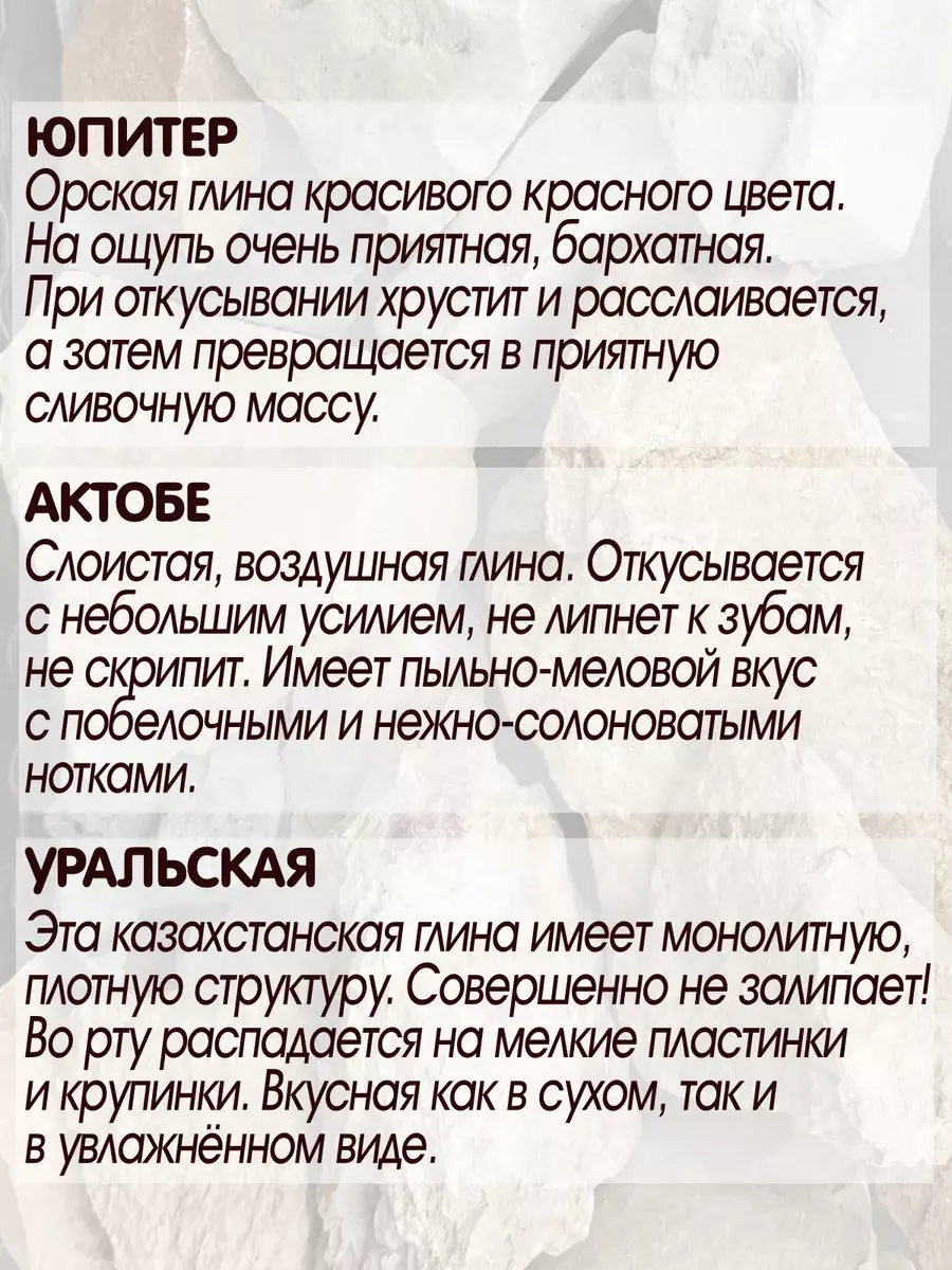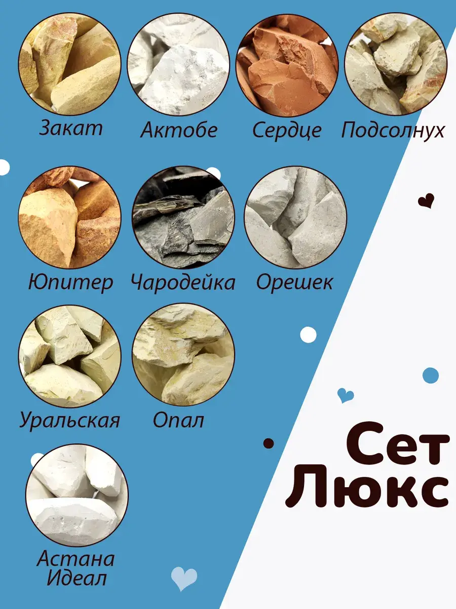В набор входит кусковая глина различных сортов: "Орешек", "Актобе", "Астана Идеал", "Подсолнух", "Закат", "Опал", "Юпитер", "Чародейка", "Сердце", Уральская" по 50гр. Каждый вид находится в индивидуальной подписанной упаковке.
