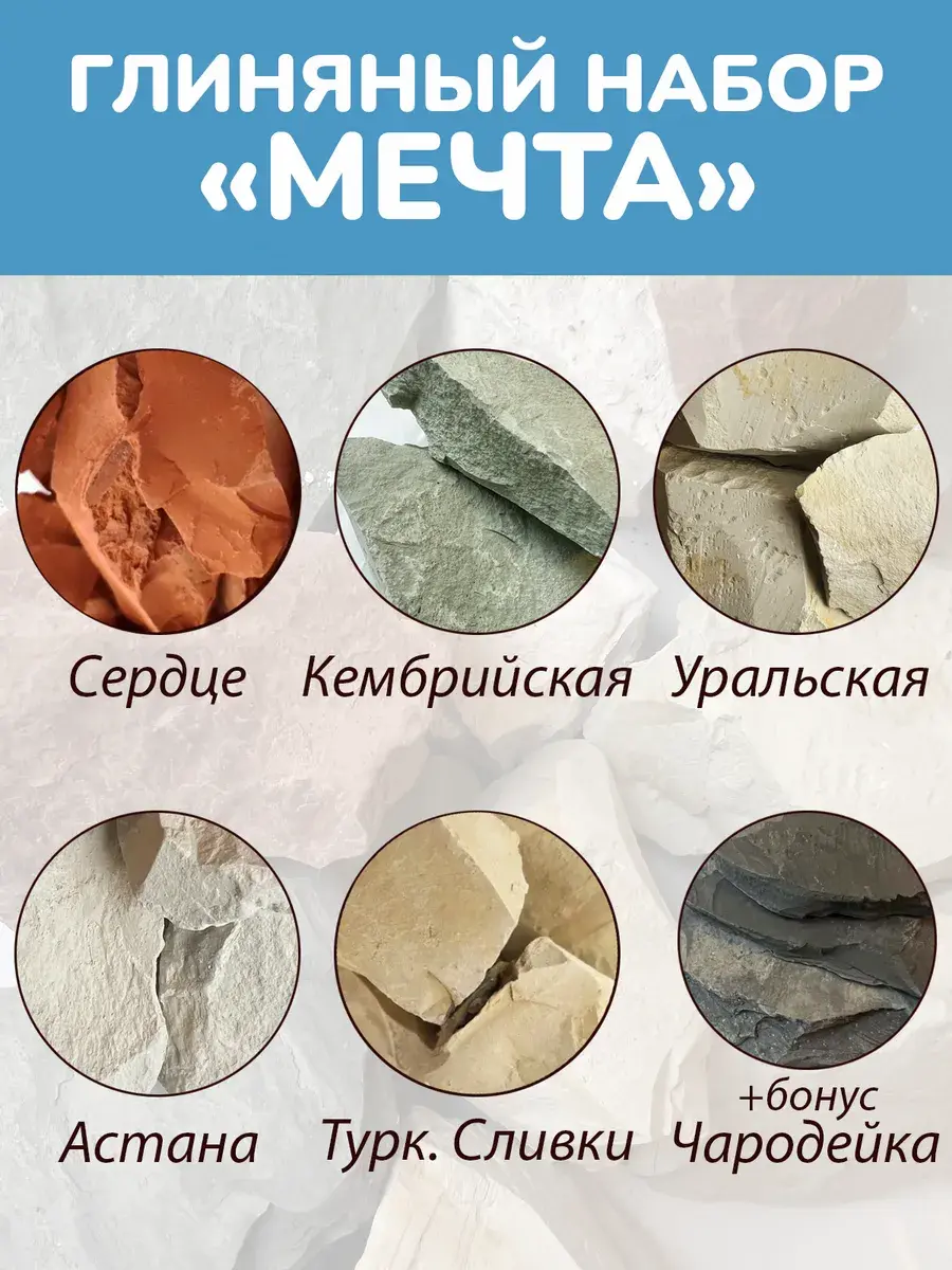 В состав набора входят глины: "Сердце", "Кембрийская", "Уральская", "Астана", "Туркестан Сливки" по 100 гр и "Чародейка" 50гр.