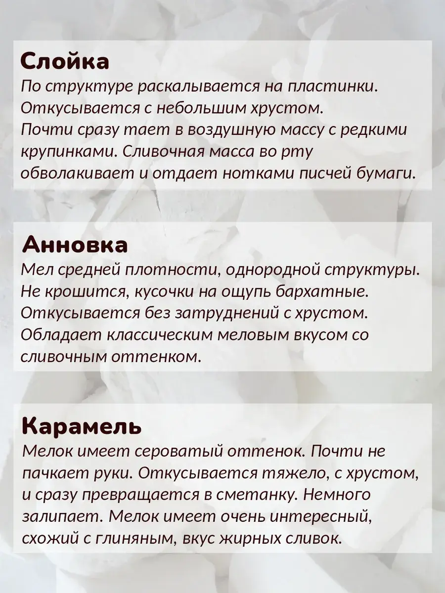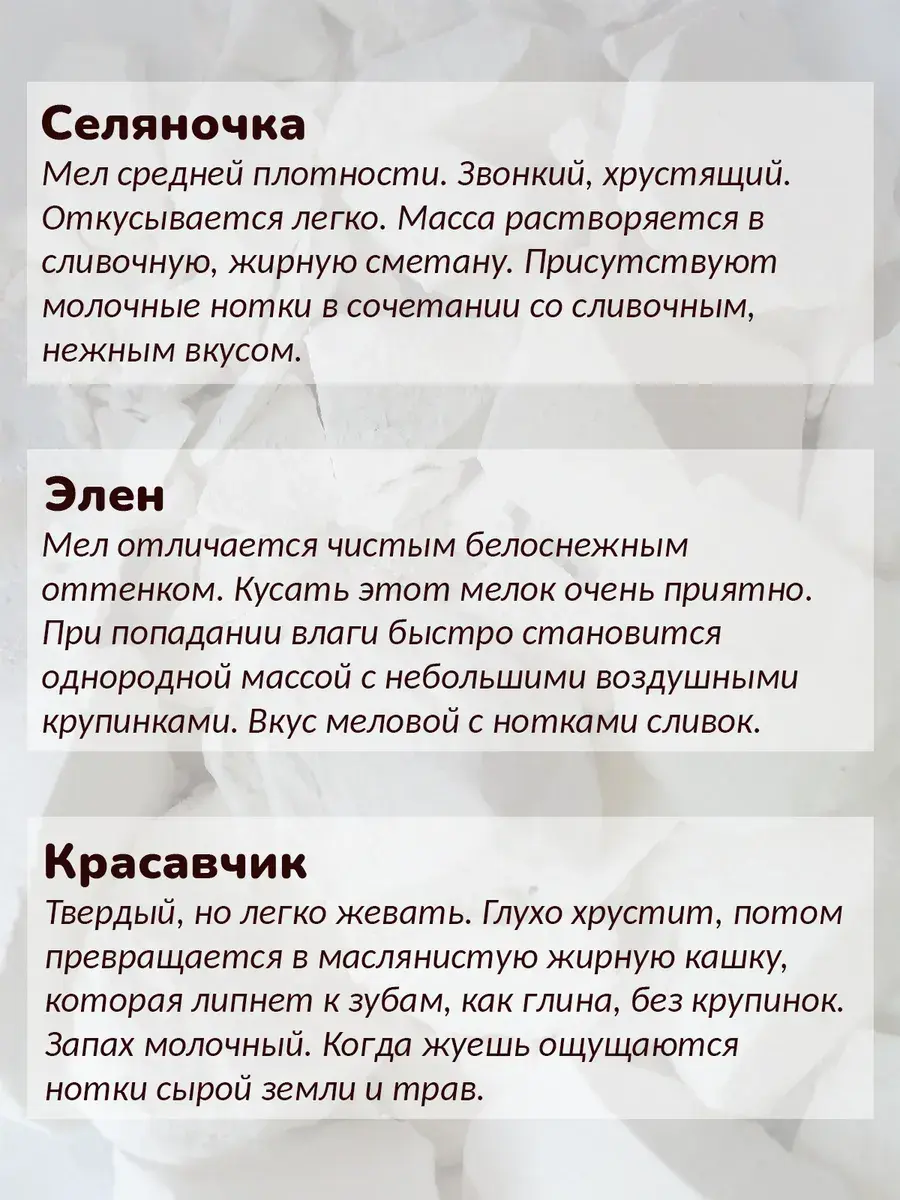 В набор входит кусковой мел различных сортов: "Слойка", "Селяночка", "Анновка", "Красавчик", "Элен" по 100 гр. и "Карамель" 50гр. Каждый вид находится в индивидуальной подписанной упаковке. Белоснежные меловые камни обладают натуральным составом, что делает их безопасными и полезными для здоровья, включая женщин в период беременности. Благодаря экологичности продукта он отлично вписывается в концепцию eco-продуктов и способствует поддержанию здорового питания. Мелок отличается звонким хрустом, что приносит удовольствие любителям ASMR-эффектов. Пиленый мел белого цвета позволяет создавать яркие и четкие линии на школьных досках, обеспечивая удобство в обучении. Так же в ассортименте есть Уральская глина.